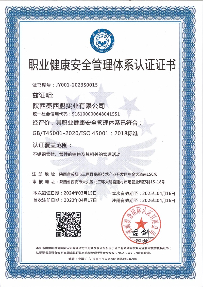 職業(yè)健康安全管理體系認證證書